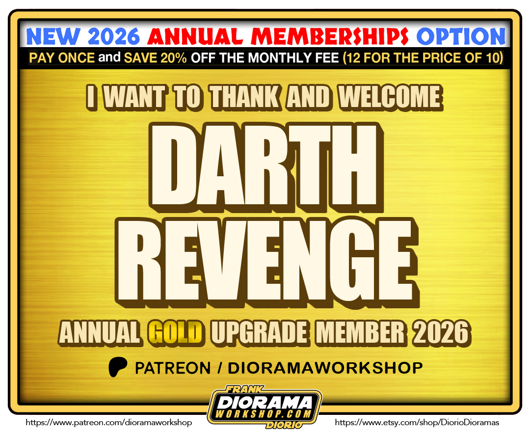 Already a long time supporter and Diorama Workshop Patreon Family member, Darth Revenge is the VERY FIRST fan to UPGRADE his monthly membership to the NEW GOLD TIER ANNUAL MEMBERSHIP for 2026 !!! YES, 2026 not only brings you MORE NEW PERKS and BIGGER Etsy Shop Savings. The regular Bronze $3 – Silver $5 and GOLD $10 a month remain but NOW Patreon has UNLOCKED the ANNUAL MEMBERSHIP OPTION – If you select this mode of payment, you will receive an INSTANT 20% OFF giving you 12 months for the PRICE OF 10 !!! PLUS your Etsy Discount gets upgraded a tier as well. It’s a WIN WIN SITUATION 🙂 Scroll down to see more details. If you want to join, click the image link below and Just select the tier that best suits your needs and come Join the Diorama Workshop family today.