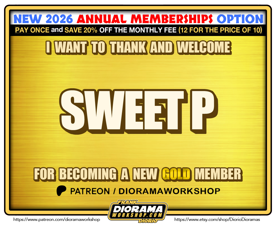 Sweet P joins us in the Patreon Family 2026 Diorama Workshop GOLD tier. PLUS: 2026 also brings MORE PERKS and BIGGER Etsy Shop Savings. The regular Bronze $3 – Silver $5 and GOLD $10 a month remain but NOW Patreon has UNLOCKED the ANNUAL MEMBERSHIP OPTION – If you select this mode of payment, you will receive an INSTANT 20% OFF giving you 12 months for the PRICE OF 10 !!! PLUS your Etsy Discount gets upgraded a tier as well. It’s a WIN WIN SITUATION 🙂 Scroll down to see more details. If you want to join, click the image link below and Just select the tier that best suits your needs and come Join the Diorama Workshop family today.